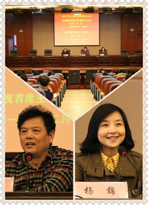 聘任仪式后,蒋煜、杨锦教授在学术报告厅为300多名师生分别做了题为《电视新闻播音的基础与业务》、《媒体融合格局中的我们》的学术报告。报告会由胡献平副院长主持。两位教授结合自己多年的从业经历,详述了从事播音员主持人工作应该具备的基本素质。他们建议学生在校期间要打牢专业基础,对自己有准确的认知,要有梦想有目标。要培养开放学习各种知识的能力,注重专业基本功的积累和训练,要有团队合作的意识和能力。他们希望同学们珍惜校园美好时光,尽最大努力追寻自己的梦想,为未来留下闪亮的记忆。