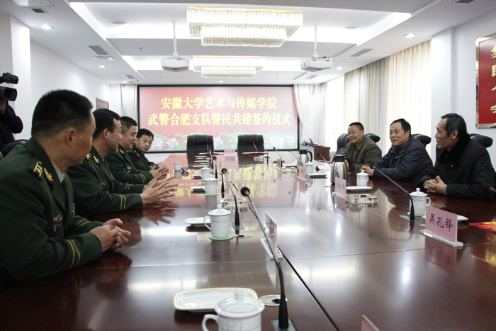 张再舟和胡献平分别讲话,他们指出,武警合肥市支队与安徽大学艺术与传媒学院签订共建协议,这是一件大好事,标志着两个单位的友好关系又揭开了新的一页,对于武警合肥市支队和学院的社会主义精神文明建设,巩固和发展警民团结的大好局面,共建和谐校园、和谐警营将起到很大的推动作用。他们表示,发挥好军地双方教育资源优势,深化共建内涵,在精神文明共建、国防教育、军地人才培养、双拥活动及日常工作等方面相互支持、相互联系、资源共享、优势互补、共同发展。相信在武警官兵和学院师生的共同努力下,警民共建之花一定会开得更加鲜艳。