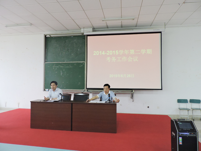 为做好本学期期末考试工作,2015年6月26日下午,学院在1号数学楼第二阶梯教室,召开考务工作会议。学院党委书记、院长周之虎教授出席会议并讲话,各教学单位负责人、全体教师参加了会议。会议由教务处副处长周爱宝教授主持。