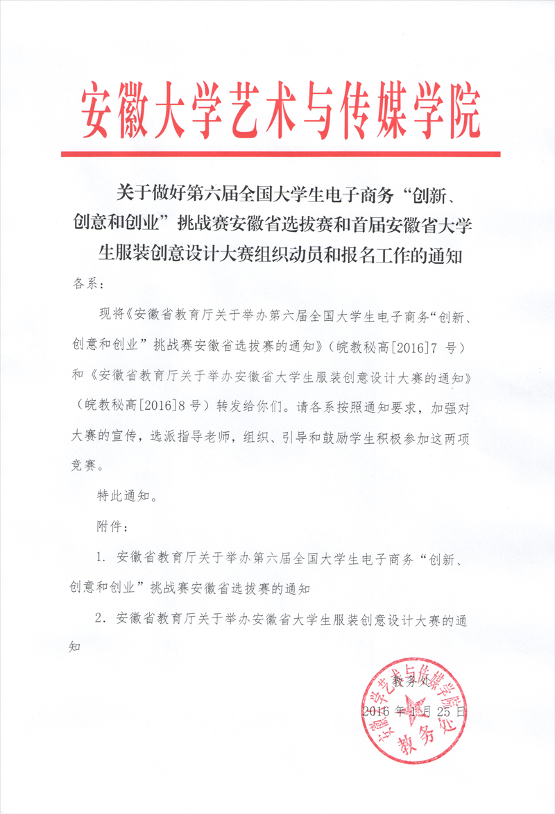 关于做好第六届全国大学生电子商务“创新、创意和创业”挑战赛安徽省选拔赛和首届安徽省大学生服装创意设计大赛组织动员和报名工作的通知
