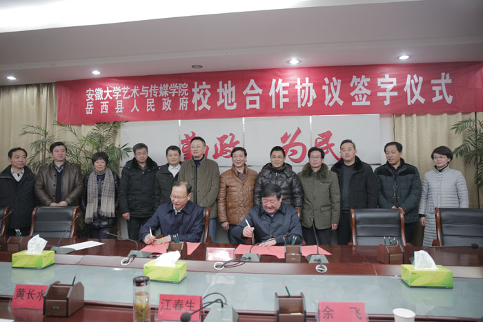 2月4日晚10点,学院与岳西县广电发展中心合作举办的岳西县2016年春节联欢晚会刚刚结束,安徽大学艺术与传媒学院与岳西县政府校政合作签字仪式在岳西县政府第一会议室举行。岳西县委副书记、代县长江春生,副县长黄长水,学院党委书记、院长周之虎,副院长张晶、郑善忠,学院综合办公室、教务处、音乐舞蹈系、戏剧影视系、新闻播音系、美术设计系、院团委,岳西县政府办、县委宣传部、文联、文化委、广电中心、旅游局等负责人出席签字仪式。岳西县副县长黄长水主持签字仪式。