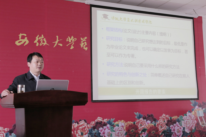 为进一步加强毕业论文指导过程管理工作,提高学生毕业论文质量,4月27日下午,教务处阚峻岭副处长以《安徽大学艺术与传媒学院毕业论文指导规范化要求》为题,进行毕业论文指导讲座。