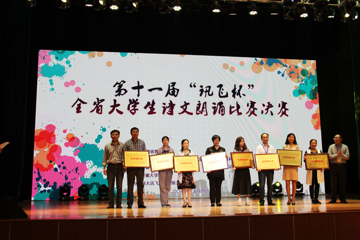 “讯飞杯”全省大学生诗文朗诵比赛由省教育厅主办,省语言文字工作委员会办公室、省教育科学研究院、省朗诵艺术学会、省普通话培训测试中心、科大讯飞股份有限公司联合举办的。比赛每年举办一次,已经成功举办十届,活动旨在积极宣传推广普通话,提高大学生普通话水平,展示当代大学生的语言素质和时代风采。本次大赛的决赛在安徽大学磬苑校区举行的。