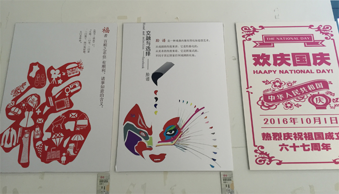 本次共展出设计类作品29件,以招贴、海报设计为主,紧扣[“两学一做”学习教育和庆国庆主题。作品有的与书法艺术结合,有的采用剪纸元素,有的运用敦煌壁画、民族舞形象,表现了绘画、体育、舞蹈等专业特色,传达了设计者对社会主义核心价值观和“两学一做”学习教育的深刻理解。作品风格新颖,构图精巧,图形图像设计富含创意,充分展示了我院师生扎实的专业功底、较高的创作能力和独有的艺术风貌,映透出他们教育事业的专注,对艺术学习的热爱,也说明我院人才培养质量在不断提升。值此安徽省第十次党代会召开和建国67周年之际,学院党委以此方式弘扬了中华传统文化,传承了民族精神,表达了我院师生对党和国家的热爱,对祖国繁荣昌盛,人民幸福安康的美好祝愿。(文/赵晨)