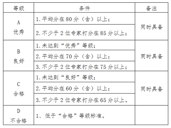 学院组成项目检查专家组,根据各项目上交的进展报告或结题报告及项目成果展示材料并对照各类项目建设目标进行检查,给出检查意见和等级(A 优秀、B 良好、C 合格、D 建议整改)。四个等级的量化标准如下: