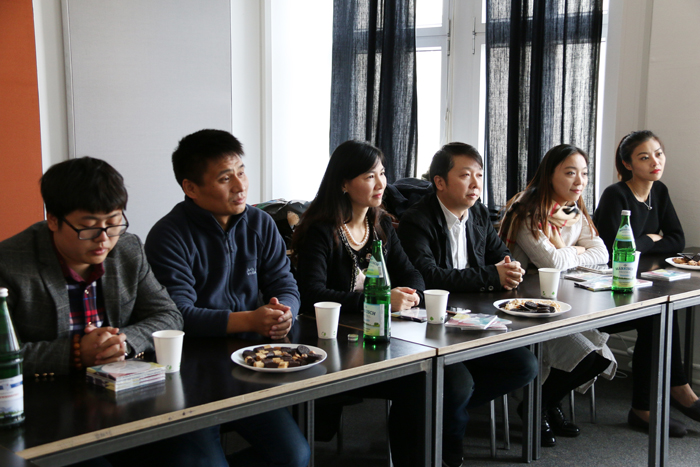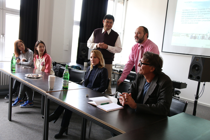 15日上午,艺术交流团一行来到了柏林流行艺术大学,在具有百年历史的前德国高速公路管理局大厦里,副校长Robert Lingnau教授、媒体设计专业负责人Peter Fischer-Piel教授和媒体市场管理专业负责人Brigitte Biehl教授(女)热情接待了交流团。