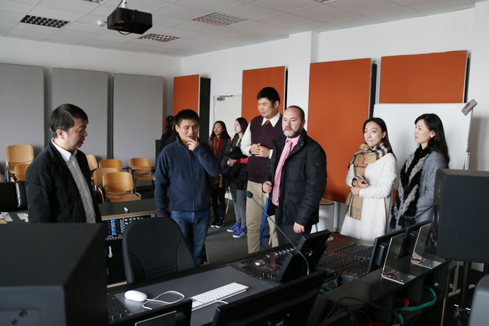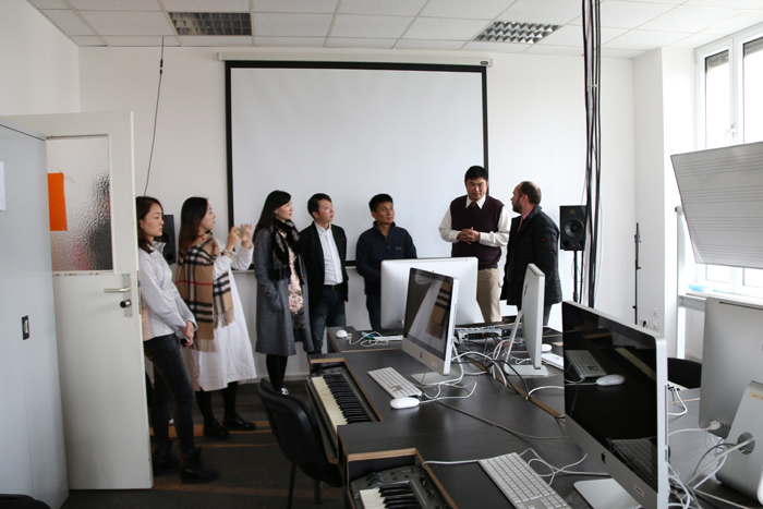 在副校长Robert Lingnau教授、Peter Fischer-Piel教授、Brigitte Biehl教授带领下,交流团一行参观了音乐制作实验室、媒体设计实验室、艺术设计授课教室、师生设计作品展示墙等教学设施,用多媒体设备展示了该校音乐教育的教学成果。