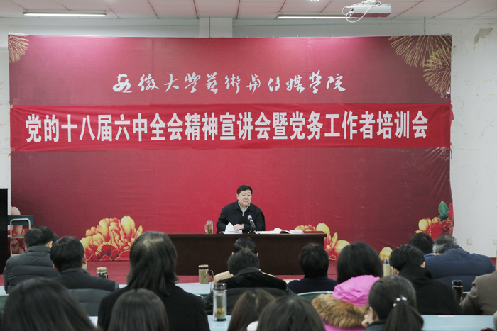 2016年12月13日下午,学院在第三阶梯教室召开党的十八届六中全会精神宣讲会暨党务工作者培训会,由学院党委书记周之虎作党的十八届六中全会精神辅导报告。院领导沈端良、张晶,学院党委中心组成员,各党总支中心组成员,学院十八届六中全会精神宣讲团成员,各党总支(党支部)书记、副书记、委员,各系部、部门负责人(助理),各内设机构负责人约70余人参加会议。