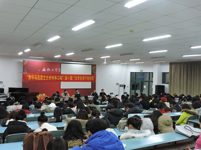 12月14日下午5点30分,我院“青年马克思主义者培养工程”第一期“大学生骨干培训班”在一教第三阶梯教室举办。学院关心下一代工作委员会副主任、马克思主义文艺理论研究所所长赵枞安教授、院学生处处长刘长华副教授、院团委组织委员孙鑫老师、宣传委员阚侃老师出席了开班仪式,开班仪式由院团委书记陈明主持,各团总支委员、院系学生会干部、各团支部书记、各班班长共计140余名大学生骨干参加了培训。