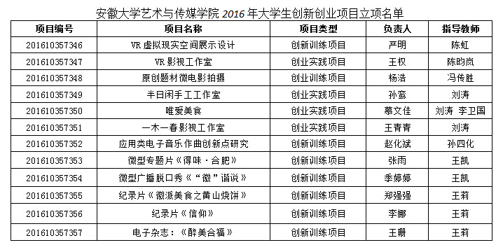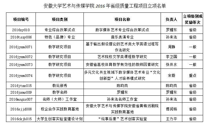 根据省教育厅《安徽省教育厅关于关于公布2016年高等学校省级质量工程项目名单的通知》(皖教秘高〔2016〕108号)文件通知,2016年度安徽省质量工程项目立项结果揭晓,我院共有11项质量工程项目、12项大学生创新创业项目获准立项。其中,专业综合改革试点项目1项,特色(品牌)专业1项,教坛新秀1项,教学名师1项,名师(大师)工作室1项,校企合作实践合作基地1项,大学生创客实验室建设计划1项,教学研究项目4项。具体名单如下: