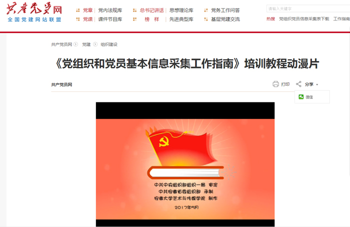 据中央组织部部署安排,党组织和党员基本信息采集工作已陆续开展,为指导各地区各部门各单位特别是基层党组织做好信息采集工作,中央组织部、安徽省委组织部委托我院制作了采集工作培训教程动漫片。6月15日该片已正式在共产党员网(http://fuwu.12371.cn/rjxz/)、安徽先锋网上线(http://www.ahxf.gov.cn)供组织部门或基层党组织集中学习、下载、观看。