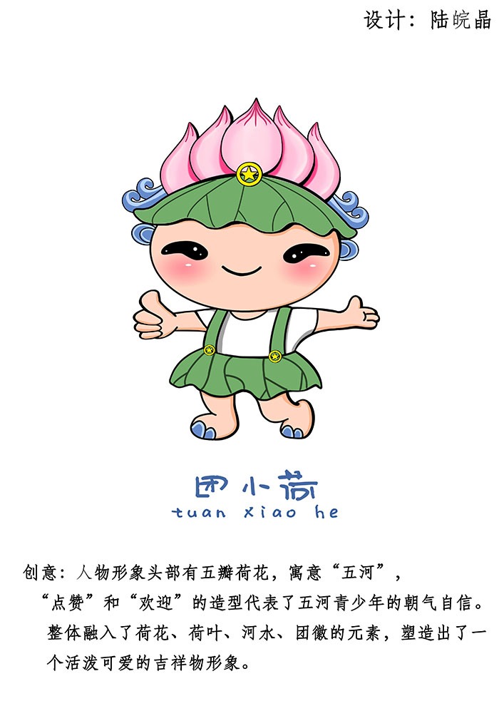 本次设计比赛由五河县共青团委主办,在全省各高校征集设计方案,旨在为县团委设计一个具有当地民俗文化特色,代表共青团组织积极向上形象的吉祥物。陆皖晶同学作品“团小荷”,经过多轮的角逐,获得了评委的一致认可,此形象将作为五河县共青团的个性化卡通形象长期使用。