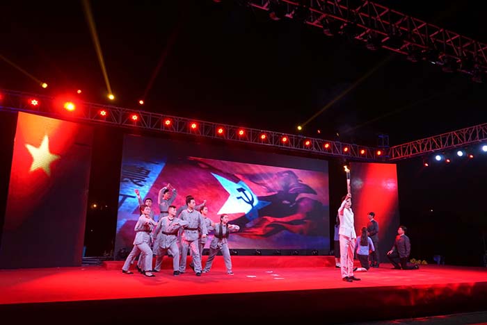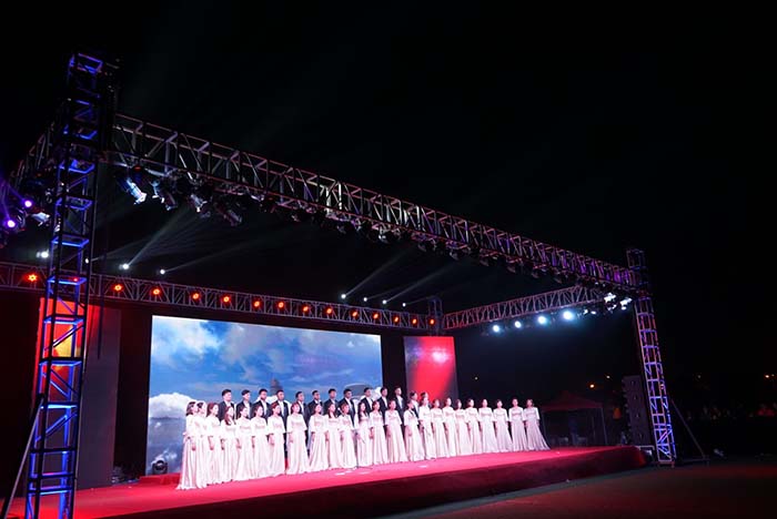 第三篇章为《致梦想》,舞蹈《南京亮》展示了中华民族苦难的历史,情景朗诵《中国旗帜》气势恢宏,振奋人心,讴歌了中国共产党带领中国人民站起来、富起来、强起来的伟大历程;大合唱《天耀中华》表达了我院师生对伟大祖国的美好祝愿。(文/朱笑笑 张娜)