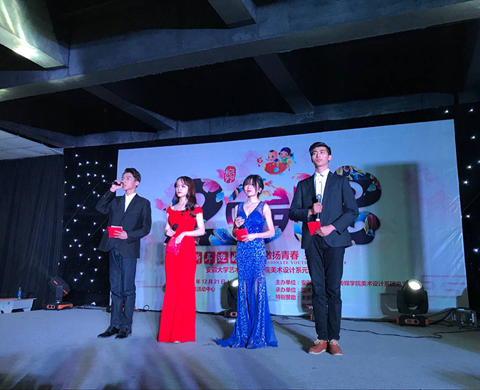 12月21日18时,由美术设计系团总支学生会主办的“激扬青春 扬帆18”元旦晚会在学院大学生活动中心举行。安徽大学艺术与传媒学院团委书记陈明、美术设计系副主任刘勇及美术设计系近300名师生共同观看了演出。此次晚会由美术设计系谢莉、卫宁、程成、孙梦婷四位同学主持。