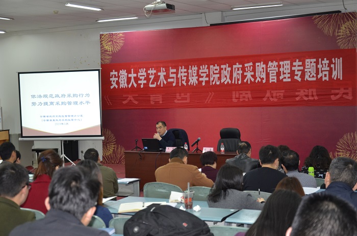 3月14日,学院邀请省财政厅省政府采购监督管理办公室主任王旭来我院做“依法规范政府采购行为 努力提高采购管理水平”讲座,我院47人、安徽中医药大学7人、安徽职业技术学院30人和安徽广播影视职业技术学院12人等4家高校96人参加此次政府采购管理专题培训,讲座由我院张晶副院长主持,财务处和总务处组织。