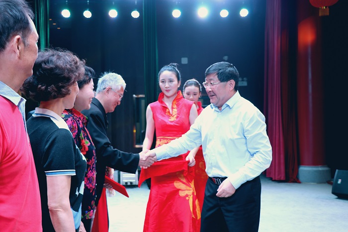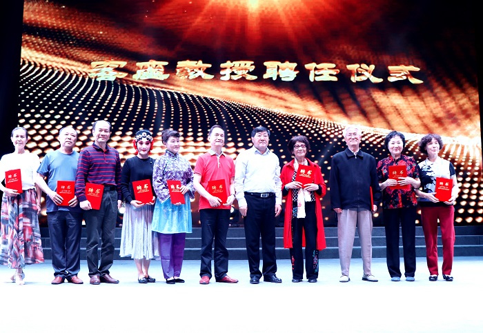 在汇报演出前的颁奖仪式上,肥东县委宣传部部长许高彬首先致辞。他充分肯定了项目取得的阶段性成果,并由衷地感谢“戏曲进校园”活动中每一位参与者。接着,学院副院长张晶发表讲话,他阐述了“戏曲进校园”活动的意义,介绍了项目的具体实施情况与构想。学院党委书记、院长周之虎为丁玉兰、路大东等十余名戏曲名家颁发了客座教授聘书。合肥市宣传部副部长王浩为肥东县十佳优秀学生戏曲社团颁发了奖牌。