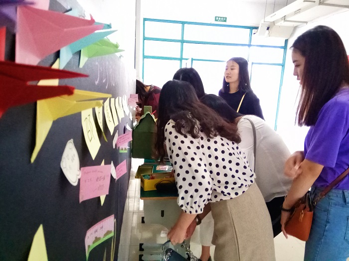 活动现场,同学们纷纷将自己对学院的憧憬、对未来生活的期望、对亲人好友的祝福等各种心里话,以化名或实名的方式写在便利贴上,张贴在“为爱发声墙”上。短短十几分钟,整个“为爱发声墙”上便贴满了同学们的“心语心愿”。现场设有“解忧杂货箱”,创意来源于日本著名作家东野圭吾的畅销书《解忧杂货店》,目的是希望同学们能够将自己在生活中、学习上遇到的各种困难烦恼以写信的形式投入箱中,后期将有专业心理辅导老师予以回复,帮助大家解决心理困惑,缓解心理压力。活动现场气氛轻松、热烈,同学们或趴在桌上,或靠墙上撰写自己的心里话,现场秩序有条不紊,不时吸引一些路过的老师参与进来。