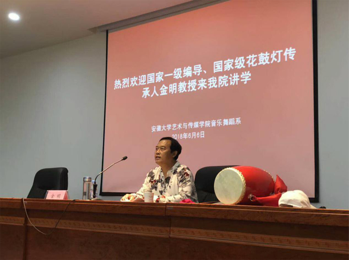 6月6日下午,国家一级编导、国家级花鼓灯传承人、教育部高级专家、安徽花鼓灯艺术研究会会长金明教授应邀在我院举办了题为《魂系淮水舞花鼓》的专题讲座。讲座由音乐舞蹈系副书记李传兴主持,一百余名师生聆听了讲座。