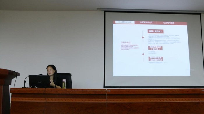 讲座的开始,黄永飞老师主要从什么是毕业论文、如何写毕业论文、论文写作规范三个方面给同学们进行了专业的指导讲解。首先,黄老师为同学们普及了毕业论文的相关概念,随后讲解了毕业论文写作的基本要求、毕业论文写作常见的规范性问题。同时从题目、摘要、关键词、正文和参考文献等方面分别讲述了毕业论文的组成部分和写作技巧。紧接着黄老师就如何开展论文选题作了讲解,希望同学们学会选取科学价值以及现实意义的选题,并学会根据自己的专业能力来选择可行的研究课题。并且要多方面的查找资料,不能局限在一个参考文献中。黄老师结合自己多年的写作经验,介绍了如何利用网络渠道进行文献检索和分析。向同学们推荐了多种可供查找的数据库和网站,这些建议对正在进行论文写作的同学们有着很大的帮助。