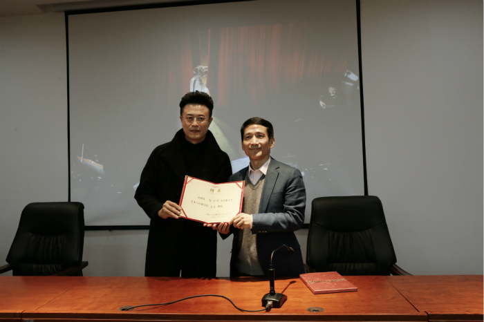 讲座前,张建华为白燕升颁发了客座教授受聘证书。教务处、戏剧影视系负责同志参加会见并聆听讲座。(郑 军)