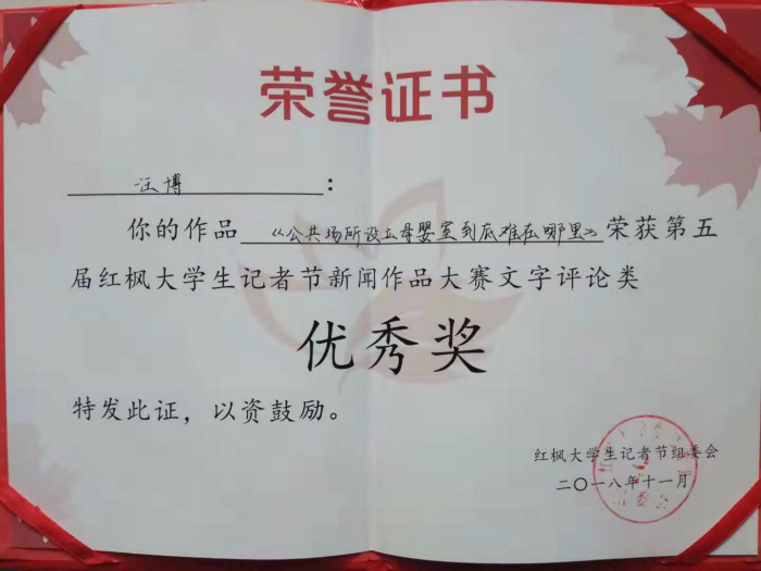 近日,全国第五届红枫大学生记者节颁奖典礼在湖南大学大礼堂隆重举行,来自清华大学、中国传媒大学、中国人民大学、中国石油大学、暨南大学、浙江大学等全国百余所高校校园媒体和校园学生记者参加了此次活动。我院新闻播音系2017级广播电视学1班汪博同学荣获新闻作品文字评论类优秀奖。
