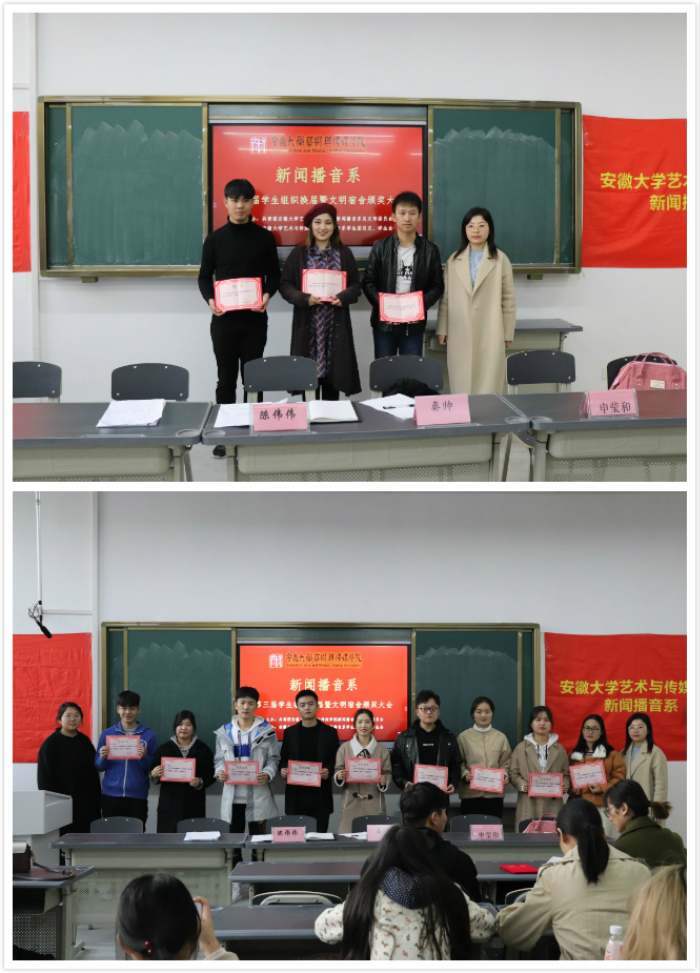 11月29日中午,由安徽大学艺术与传媒学院新闻播音系党总支主办、团总支学生会承办的第三届学生组织换届暨“文明宿舍”颁奖仪式在美术楼104教室举办。系学生党支部书记、学管办主任秦帅,系团总书记陈伟伟,系团总支副书记申莹和、系团总支学生会全体成员和“文明宿舍”寝室代表共计40余人参会。