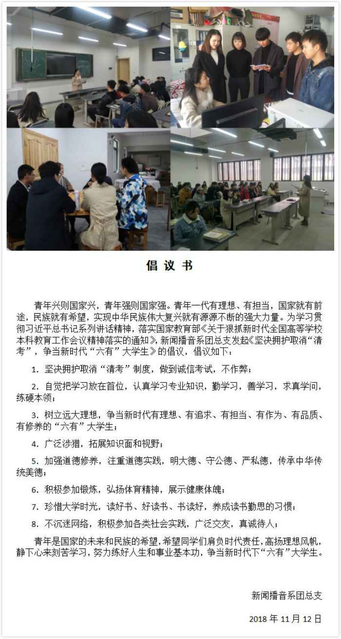 为学习贯彻习近平总书记在全国教育大会上的重要讲话精神,全面落实教育部《关于狠抓新时代全国高等学校本科教育工作会议精神落实的通知》,进一步提高学院师生的专业素质和能力,近日学院新闻播音系团总支在全系范围内发起了关于《坚决拥护取消“清考” 争当新时代“六有”大学生》的倡议,并得到了学院领导的充分肯定。