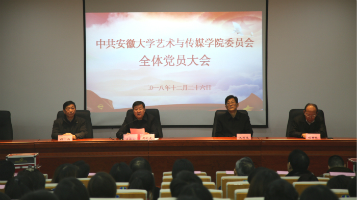 12月26日上午,中共安徽大学艺术与传媒学院委员会2018年全体党员大会在美术楼报告厅召开,学院党委书记、院长周之虎主持大会,党委副书记沈端良,党委委员、副院长张晶,党委委员、副院长程世锁出席大会,机关、各系党支部师生正式党员共计208人参加了本次大会。