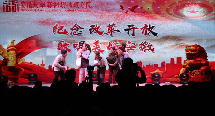 12月28日19时,学院“庆祝改革开放·歌唱美好安徽”2019迎新年晚会在大学生活动中心隆重举行。学院党委委员、副院长张晶和张建华莅临晚会现场,学院各系、各部门负责同志和师生代表一起观看了演出。晚会由新闻播音系老师王雅卓、杜衎主持。