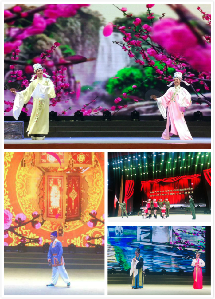 赞祖国盛世,展艺传风采。1月8日下午14时,由安徽大学艺术与传媒学院主办、戏剧影视系承办的庆祝改革开放40周年小品小戏展演活动在合肥市丁玉兰庐剧院举行,学院领导及相关部门负责人观看了本次演出。
