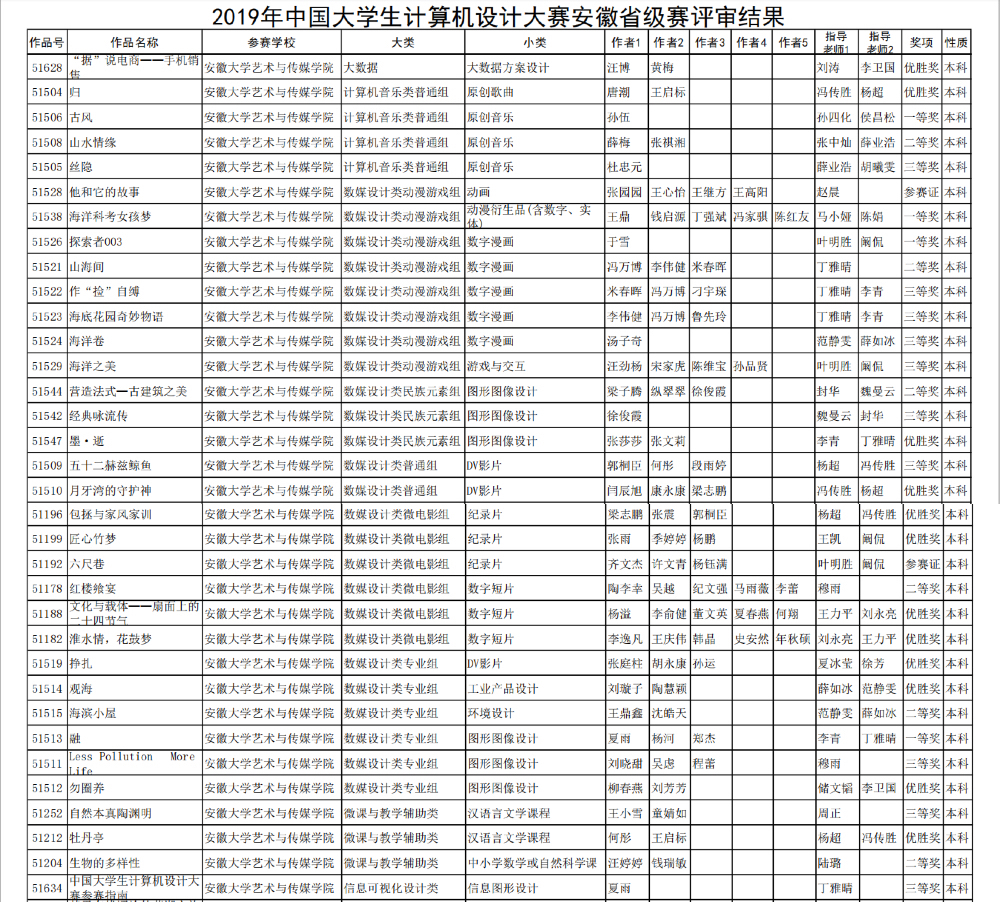 5月15日,根据“中国大学生计算机设计大赛安徽省级赛”官网评审结果公示,我院参加2019年中国大学生计算机设计大赛安徽省级赛的34件作品中,经大赛委员会组织省内外专家评审,再获佳绩。共获得4个一等奖、6个二等奖,10个三等奖、12个优胜奖。获奖名单如下: