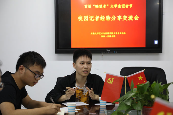 用镜头记录生活,以文字传递文明。5月25日下午,首届“瞭望者”大学生记者节校媒交流会在我院舞蹈楼二楼会议室召开。来自兰州大学、中国人民解放军国防大学军事文化学院、江苏师范大学、安徽师范大学、大连海事大学、山西农业大学信息学院、合肥幼儿师范专科学院等校媒团队的学生记者齐聚一堂,共同探讨新时代校媒发展之路。学院大学生通讯社摄制中心、新媒体中心部分学生记者参加交流。交流会由通讯社副社长黄梅主持。