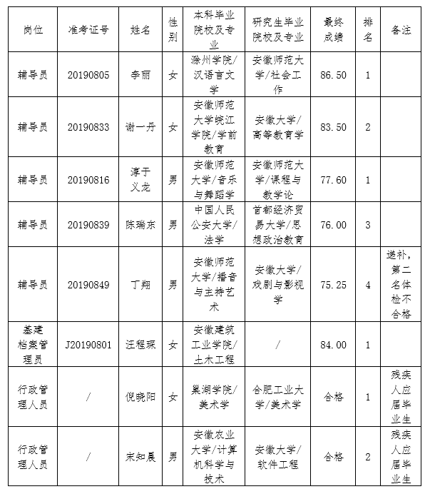 根据乐动网官网2019年公开招聘公告及安徽省残疾人大中专毕业生就业绿色通道等政策要求,经过资格审查、考试考核、体检政审等程序,经学院研究,拟确定李丽等8位同志为聘用人员,现予公示如下: