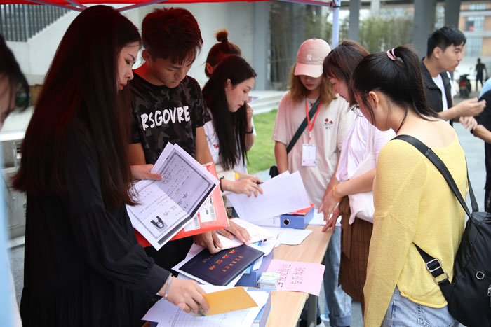 迎新现场,美术设计系的学生党员和学生干部们组成志愿服务团队,佩戴统一徽章,各司其职,他们分成统筹组、登记组、引导组、服务站和新闻记录组开展工作。报到现场志愿者们帮助新生班辅导员确认每位新生的入学资格、核对缴费情况、发放校园卡等工作。宿舍服务站和引导组也是热火朝天、充满干劲,志愿者们为新生和家长解决问题,提供便利,将每一名新生及家长送到宿舍并做好安置。
