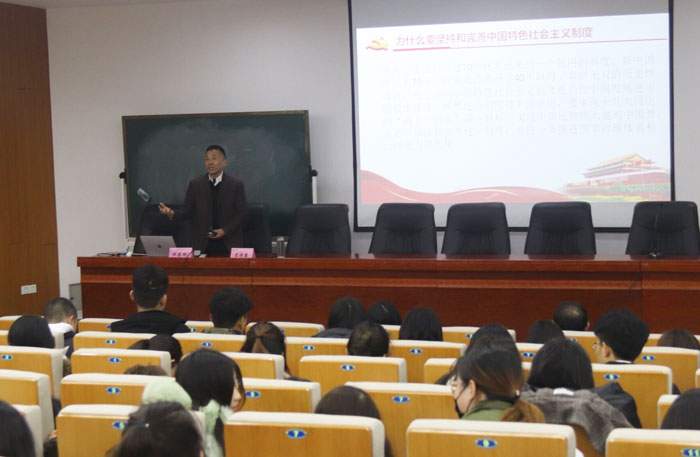 樊嘉䘵以《制度自信:党的十九届四中全会精神解读》为题宣讲。他联系经济社会发展和学院发展实际,从为什么要坚持和完善中国特色社会主义制度、为什么如此强调制度建设、党的十九届四中全会精神都讲了什么以及怎样确保全会确定的目标落实到位等四个方面,对坚持和完善中国特色社会主义制度、推进国家治理体系和治理能力现代化进行阐释,并穿插以鲜活的案例,在深入浅出中让参与宣讲学习的师生了解党的十九届四中全会重要意义。