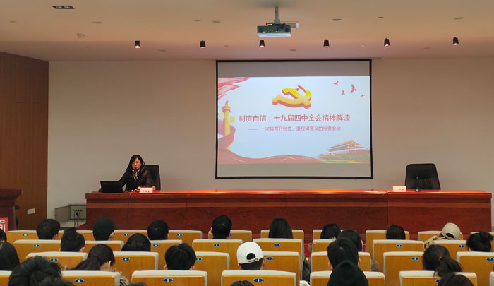 张晶围绕《中共中央关于坚持和完善中国特色社会主义制度、推进国家治理体系和治理能力现代化若干重大问题的决定》,从坚持和完善中国特色社会主义制度、推进国家治理体系和治理能力现代化的重大意义、深刻领会中国特色社会主义制度和国家治理体系的显著优势,坚定中国特色社会主义制度自信等六个方面进行细致解读,并联系学院发展实际,使参与宣讲学习的学生充分了解党的十九届四中全会的重要精神。