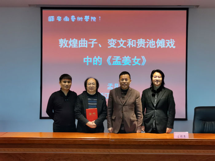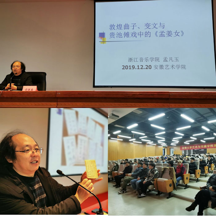 随后,孟凡玉为我院师生作了题为《敦煌曲子、变文和贵池傩戏<孟姜女>》的学术报告。孟凡玉首先梳理了中国四大民间爱情故事《孟姜女》的衍变,并对敦煌藏经中曲子、变文《孟姜女》以及民歌《孟姜女》进行详细分析。通过对贵池傩戏中《孟姜女》的文化特征解读,得出敦煌曲子、变文、贵池傩戏《孟姜女》不仅是该题材的歌舞艺术在不同历史时空的表现样本,也是跨越时空、联系古今的文化纽带。贵池傩戏《孟姜女》是敦煌曲子、变文《孟姜女》的历史遗存,是在继承敦煌曲子、变文传统的基础上发展演化而成的民间艺术。(撰稿:潘捷 摄影:方悦悦 初核:孙来法 审定:束舒娅)