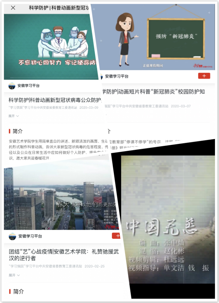 疫情期间,我系师生制作完成了多部短视频作品,有声情并茂的朗诵、有形象有趣的动画短片、有独具匠心的MV。截止目前,我系共有4部短视频作品在学习强国安徽平台发布,分别是朗读类短视频《春天,你将以他们而更加荣光》、疫情防护知识普及的动画短片《新型冠状病毒公众防护指南》《预防新冠状病毒》以及参与学院原创歌曲视频制作的《中国无恙》《在春天拥抱温暖》。同时,《抗“疫”的春天一定到来》《共同战“疫”》等多首朗诵作品在学院官网、博闻雅音公众号等平台发布。与音乐舞蹈系共同制作的《中国无恙》、与院团委联合制作的《在春天拥抱温暖》在多个省级媒体发布,收到良好的社会反响。