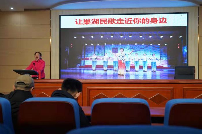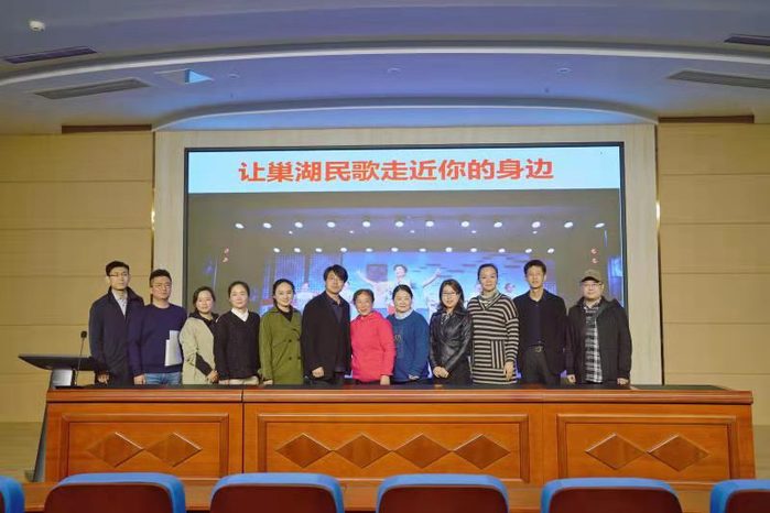 在近两个小时的讲座中,李家莲结合自身多年在巢湖民歌演唱和研究方面的经验,通过实例为大家绘声绘色地讲解了巢湖民歌的发展历史、曲调唱腔、代表作品等,并进行了现场范唱,得到了台下师生阵阵掌声。