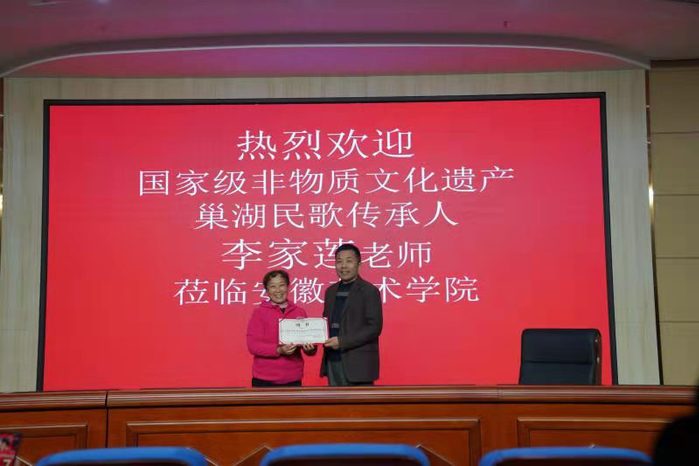 在讲座正式开始之前,校党委副书记、院长樊嘉禄上台致辞,对李家莲的到来表示热烈欢迎和感谢,现场为李家莲颁发客座教授聘书,并嘱咐师生要重视安徽非遗文化的传承与学习。讲座由音乐舞蹈系主任孙来法主持。
