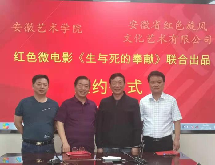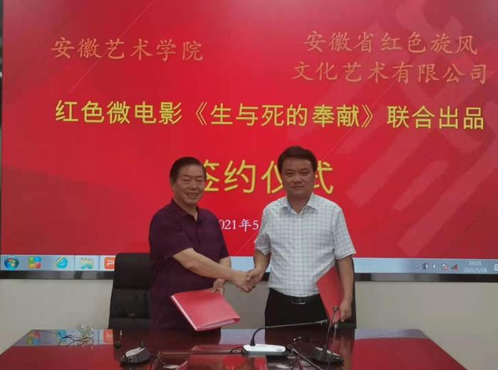 5月28日下午,我校与安徽省红色旋风文化艺术有限公司签约,联合出品红色微电影《生与死的奉献》。校行政负责人张晶,安徽省红色旋风文化艺术有限公司董事长、著名影视编剧傅琳,校科研处、发展规划处处长陈明海,影视制片人傅桂等参加签约仪式。陈明海代表学校与安徽省红色旋风文化艺术有限公司签订联合出品协议。