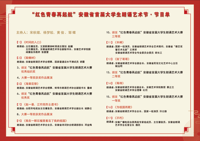 安徽省首届大学生朗诵艺术节不仅为广大在校学生提供了展现自我的舞台,更是一场朗诵爱好者们的盛会,通过朗诵艺术的方式歌颂中国共产党成立100周年来的光辉历程和伟大成就,歌颂改革开放的伟大成就和祖国各地欣欣向荣的新气象、新面貌。(撰稿:张雷雷 初核:王琍琍 审定:束舒娅)