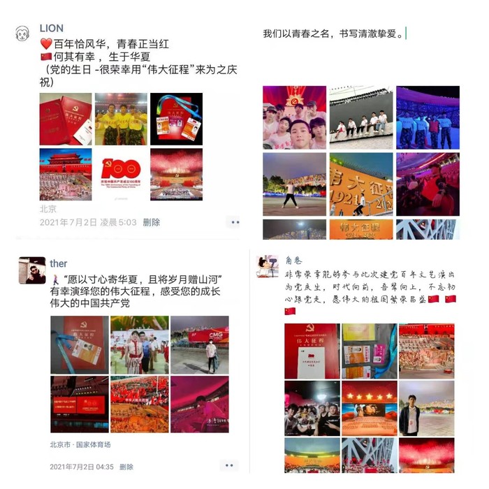 6月28日晚,由中央宣传部、文化和旅游部、国家广播电视总局、中央广播电视总台、中央军委政治工作部、北京市主办的庆祝中国共产党成立100 周年大型情景史诗《伟大征程》在国家体育场盛大举行。习近平、李克强、栗战书、汪洋、王沪宁、赵乐际、韩正、王岐山等党和国家领导人,同约2万名观众一起观看演出。7月1日晚,《伟大征程》在中央广播电视总台播出,全国各级广播电视主频道、主频率各新闻网站、新媒体平台同步转播。