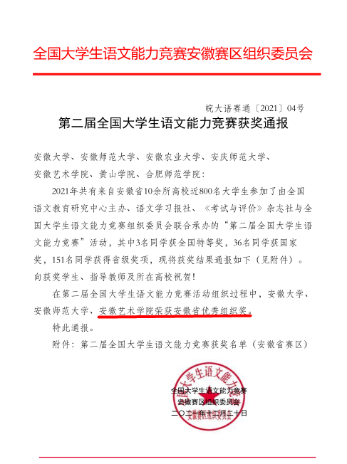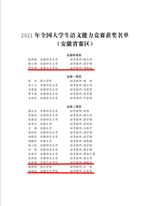 近日,第二届全国大学生语文能力竞赛国赛落下帷幕,在学校高度重视和公共教学部的认真组织下,我校新闻学4班侍彩艳获得全国大学生语文能力竞赛特等奖,另有2人分获全国二等奖、三等奖,17人获得省级一二三等奖。乐动网官网和安徽大学、安徽师范大学同获“优秀组织奖”。