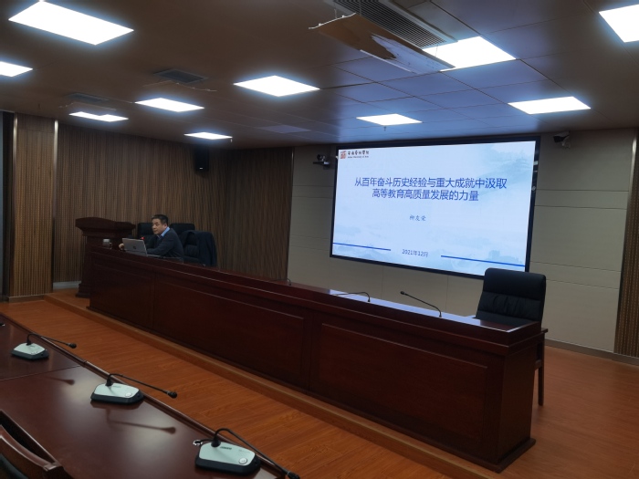 柳友荣以“从百年奋斗历史经验与重大成就中汲取高等教育高质量发展的力量”为题开讲,对习近平总书记在党的十九届六中全会上的重要讲话作了全面、系统的解读。柳友荣带领同学们回顾了百年教育历史成就,强调了新时代高等教育发展面临的新问题、新要求,并结合自身心得体会与学校实际,阐述了探索高等教育高质量发展的新路径。