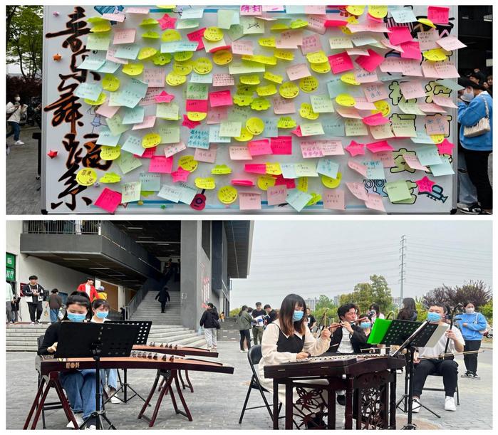 活动开始前,音乐舞蹈系第一、第三学生党支部的党员同志们精心制作宣传栏,布置活动现场。第二学生党支部的党员准备了精彩的现场民乐表演。在《歌唱祖国》《唱支山歌给党听》《映山红》的演奏声中,老师与同学们纷纷留言,写下对学校的美好祝福。(撰稿:夏思雨 摄影:卢茜茜 初核:孙来法 编辑:朱新水 审定:束舒娅)