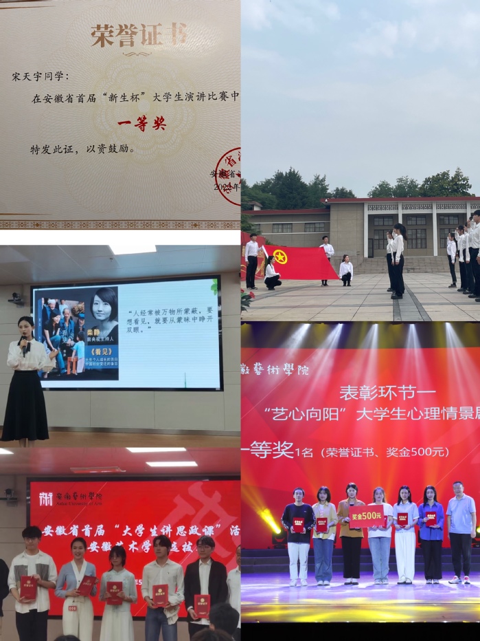 宋天宇同学在安徽省演讲学会的新生杯演讲比赛中荣获一等奖,展现了表演专业同学在演讲台上的不俗功力。首届“书香伴青春 百部经典阅读”优秀读书笔记暨演讲比赛中,陈雨露同学摘得一等奖并荣获“演讲之星”称号,让大家看到了她强大的舞台表现力。