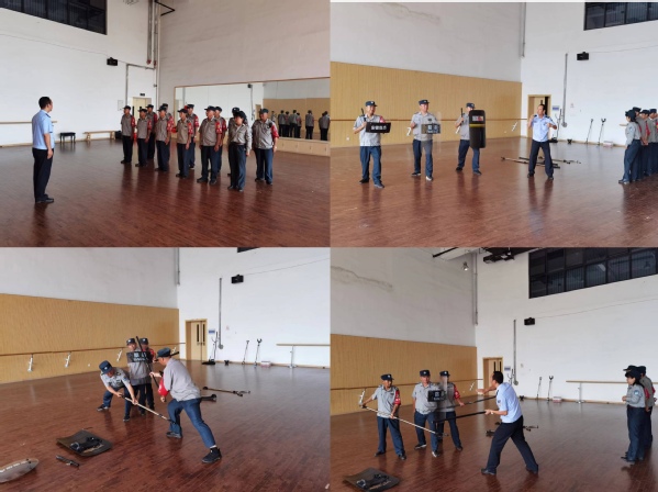 杨骏讲解反恐防爆应急处置方法,对防爆器具使用进行详细讲解,对警棍、盾牌和脚叉进行操作演示,并让全体保安人员分组进行实操。学校13名保安参加培训。