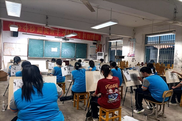 八月如火,在六安市霍山县诸佛庵中学的课堂上,设计学院20级视觉传达3班学生董紫晴正耐心地和学生们讲解素描基础课程知识点,指导学生们一笔一画、一线一条地反复练习。