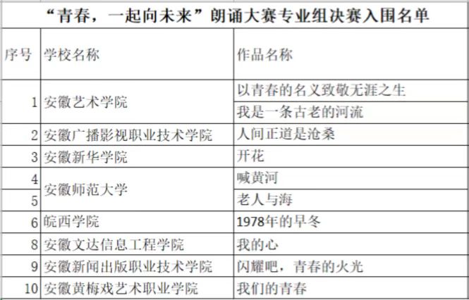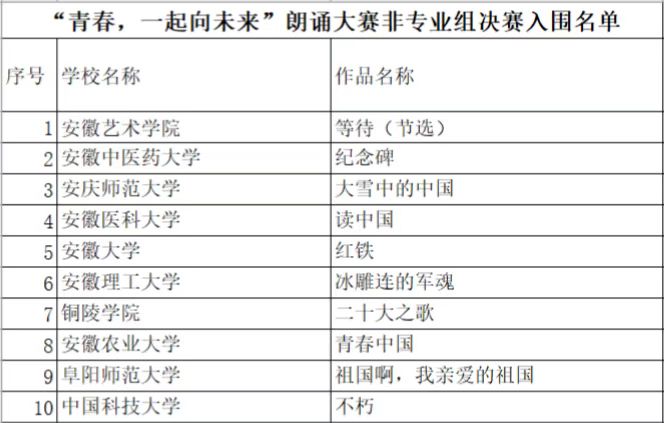 为喜迎党的二十大胜利召开,活跃高校校园的阅读氛围,充分展示当代青年大学生感党恩、听党话、跟党走的精神风貌,“青春,一起向未来”安徽省大学生朗诵艺术节已经启动。现将朗诵大赛进入决赛阶段的名单公布如下: